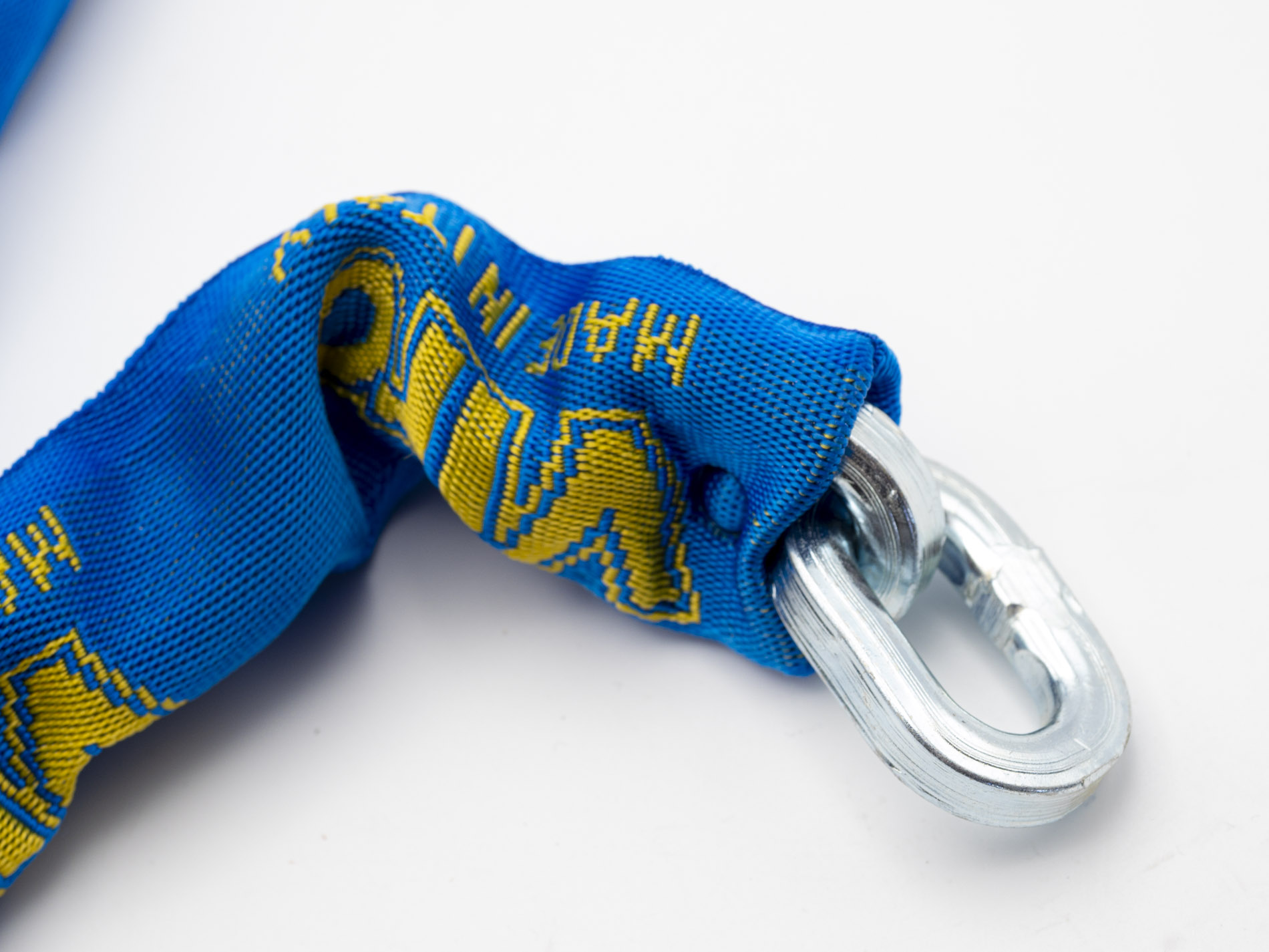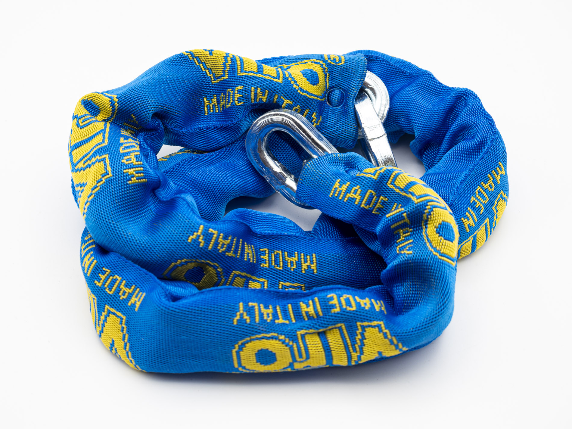 Catena antifurto a filo semiquadro/esagonale antitaglio in acciaio cementato temprato e zincato, la forma della sezione rende più difficile il taglio con cesoie e tagliabulloni. Ricoperte con guaina antigraffio lavabile per poter essere applicate anche su superfici verniciate o cerchi in lega senza rischio di rovinare il materiale. Compatibile con lucchetti ad arco o bloccacatena.